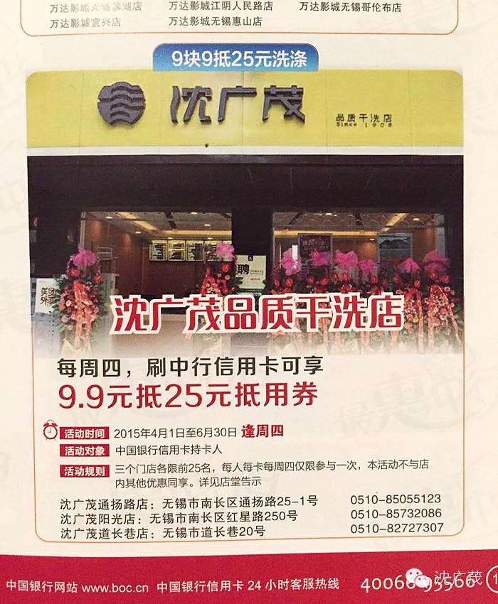 1.上述的每周四在各门店,客户刷中国银行信用卡消费9.9元,即可享受价值25元抵用券;