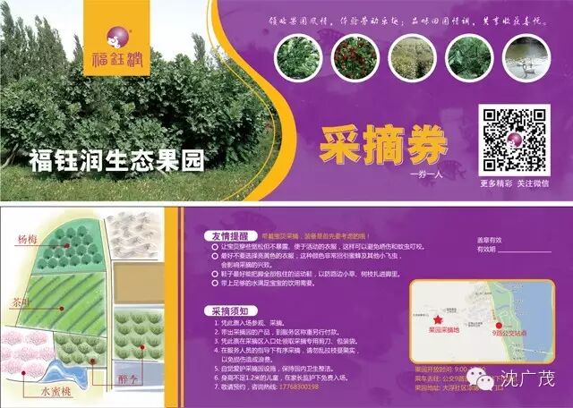 1. 回馈沈广茂的持卡客户,并关注“沈广茂”微信和“福钰润”微信,凭卡到各门店领取“福钰润生态果园”入场券两张。(2个大人免一个小孩)